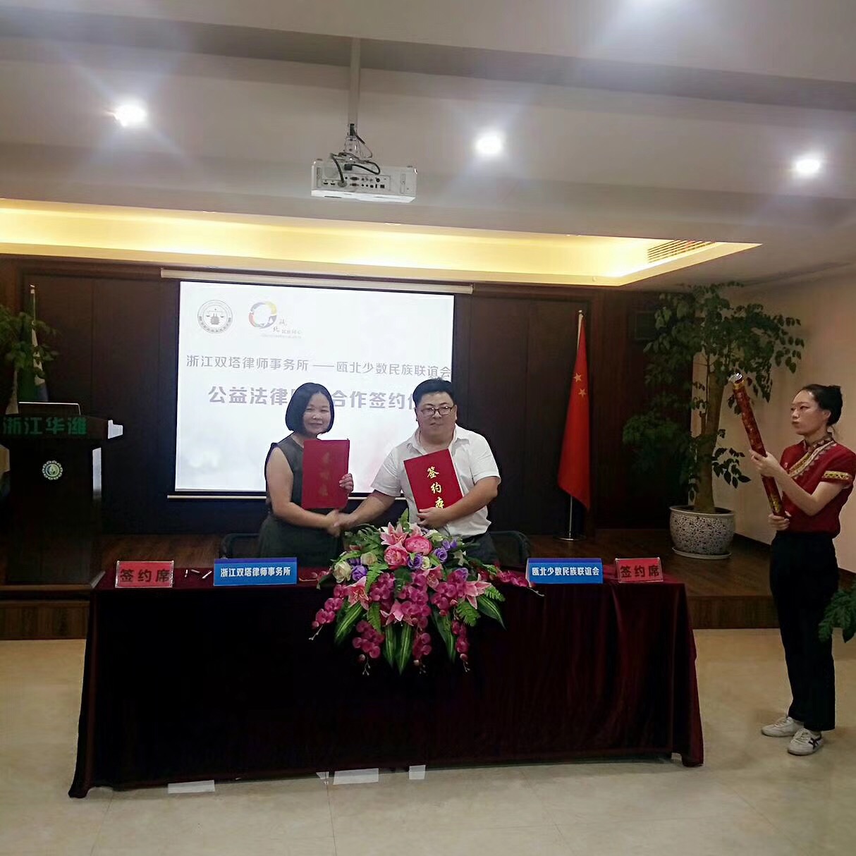 8月17日,瓯北街道少数民族教育活动基地揭牌现场,浙江双塔律师事务所与瓯北少数民族联谊会签订《公益法律服务合作协议书》。