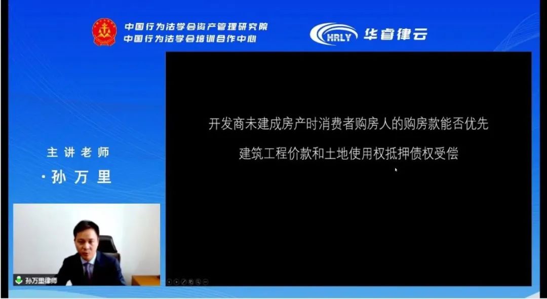 受疫情影响,中国行为法学会培训合作中心于近日在线上举办为期两天的《企业破产疑难问题解析研修班》,嘉瑞成所孙万里律师受邀作为主讲嘉宾之一,做《房企破产疑难问题》课题讲座,全国各地约300位管理人律师在线上听课。