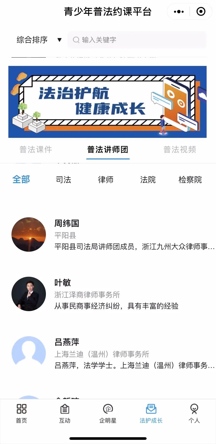 “普法讲师团”版块聚力整合多元法治教育主体,入驻了共109名普法讲师,包含13名法官、18名检察官、4名司法行政工作人员、9名教师、61名律师,以及4名其他行业普法代表。