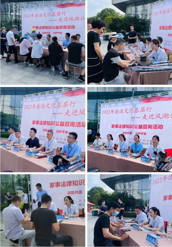 2022年6月25日,为响应实施浙江省司法厅印发的《“法助共富、法护平安” 专项行动方案》文件,由平阳县法学会主办,浙江腾鳌律师事务所承办的 “ 2022年法治文化基层行 —— 走进凤湖公园 ” 法律服务公益活动在凤湖公园正式举办,腾鳌所律师为社区居民提供家事法律公益咨询服务。