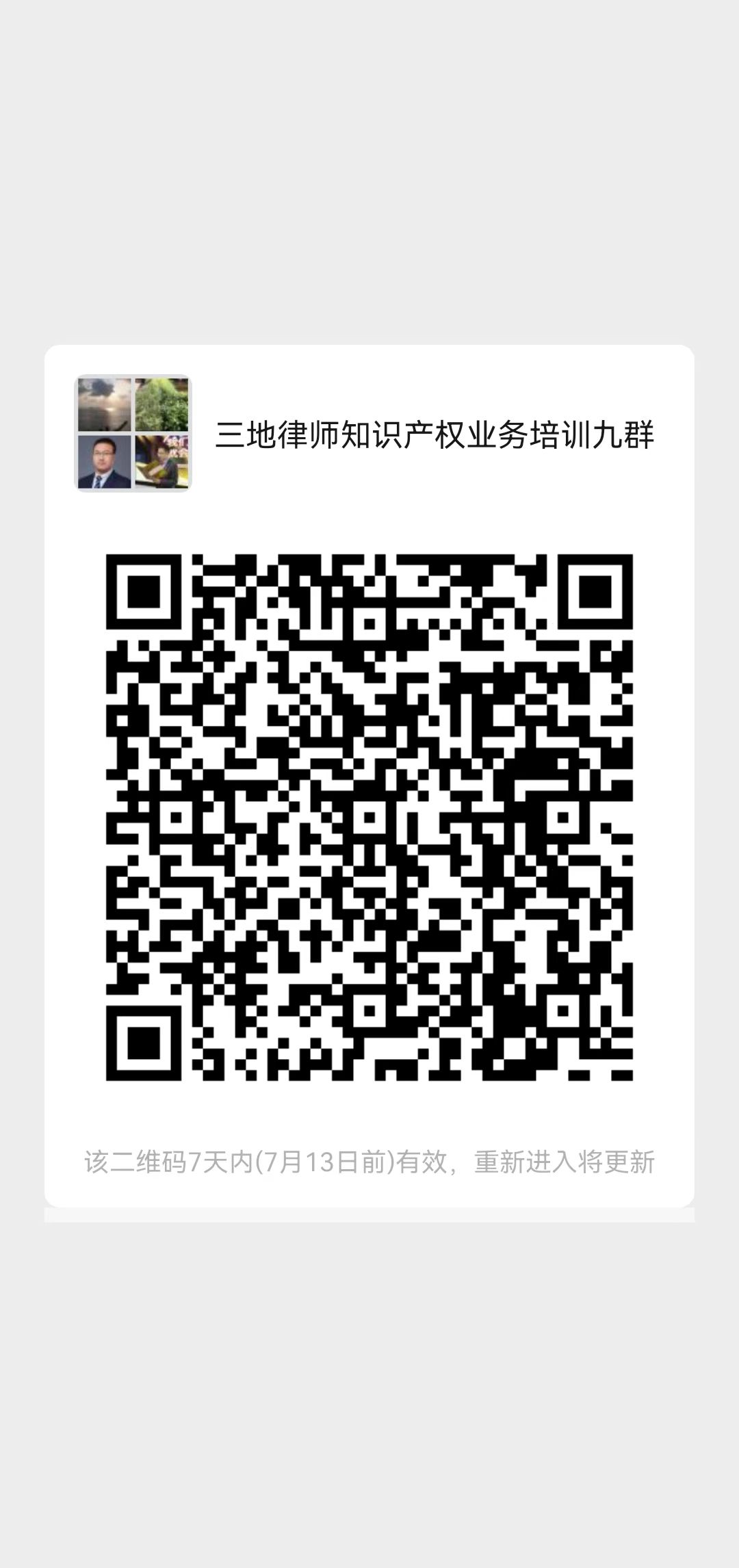 腾讯线上会议(温州市、台州市、金华市律师协会知识产权专业委员会、金华市律协婺城分会知识产权专业委员会全体委员请加微信一群,其他非知产委委员报名人员未曾加二群、三群、四群、五群、六群、七群的,可以直接扫码加八群,会议号将在会议开始前在微信群内发送,微信群二维码见附件)。