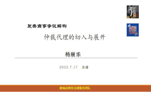 7月17日星期日下午,嘉瑞成所管委会主任杨康乐律师对话嘉瑞成(乐清)所青年律师,带来了一堂精彩、独到、实用的复杂商事争议解构讲座。本次讲座背景是嘉瑞成商务法律服务团队主办的第七期“吕家岸沙龙”,杨康乐律师主讲《仲裁案件代理的切入与展开》。