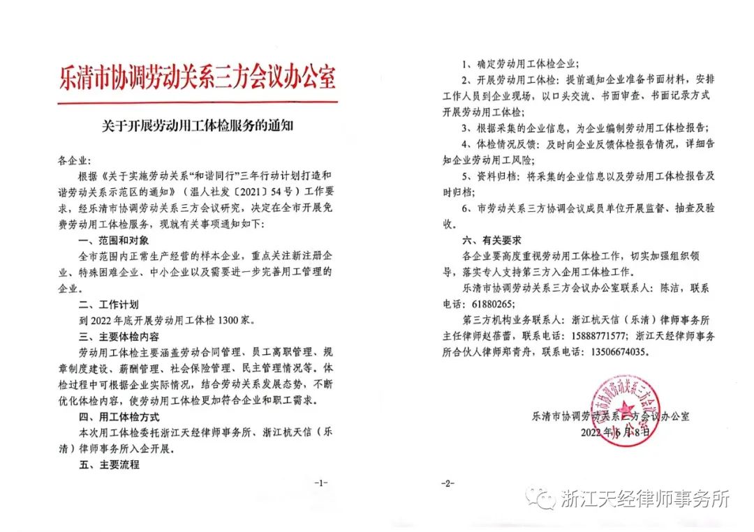 为积极推进全市“和谐同行”三年行动计划,经乐清市协调劳动关系三方会议(乐清市人力资源和社会保障局、乐清市总工会、乐清市企业联合会/企业家协会、乐清市工商业联合会)研究,决定在全市开展免费劳动用工体检服务,本次用工体检特委托浙江天经律师事务所与浙江杭天信(乐清)律师事务所入企开展。