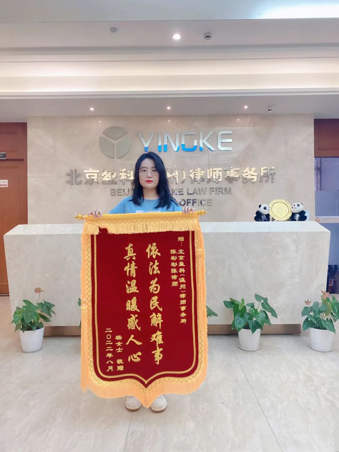 近日,北京盈科(温州)律师事务所陈彬彬律师收到委托人送来的锦旗。“依法为民解难事,真情温暖感人心”十四个字充分体现了委托人对盈科(温州)所律师专业尽责职业素养的高度认可。