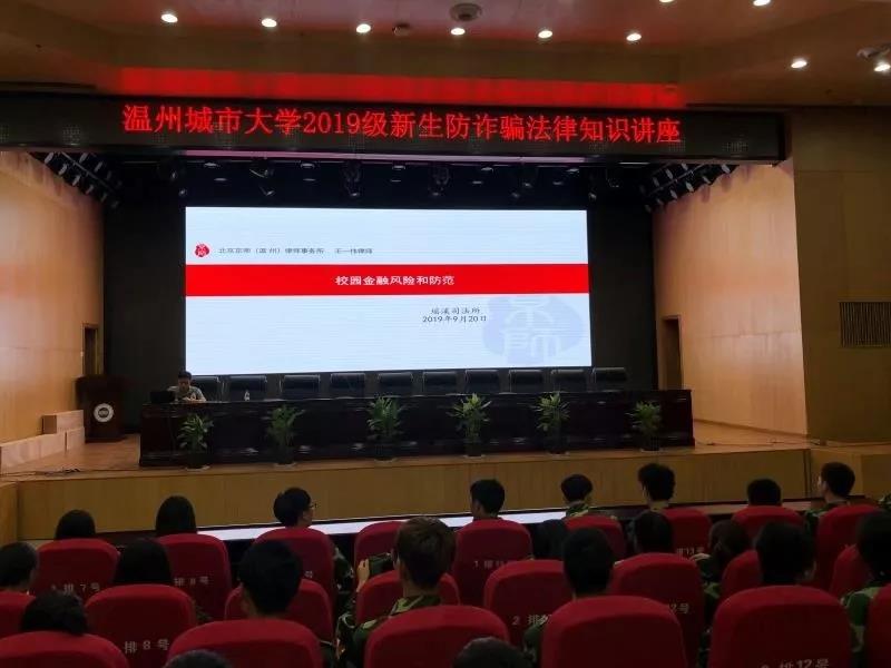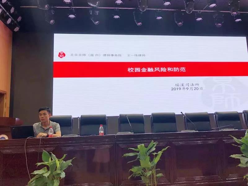 近期,部分不良网络借贷平台诱导在校大学生过度消费,使其陷入高利贷陷阱的案件频发,“校园贷”已成为全社会关注的热点问题。为进一步加强在校大学生的网络金融风险防范意识,提高对校园网贷陷阱的警惕,近日,北京京师(温州)律师事务所高级合伙人王一伟律师受邀为温州城市大学2019届新生作《校园金融风险和防范》的法律讲座。