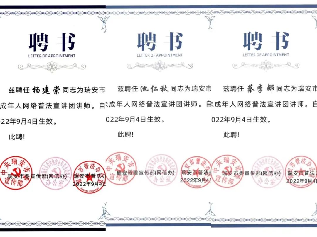 2022年9月7日,浙江玉海律师事务所池仁秋律师参加了由市委宣传部主办,市司法局、市妇联、市融媒体中心承办的瑞安市未成年人网络普法中心揭牌启动暨首场宣讲活动。玉海所杨建崇、池仁秋、蔡李娜律师入选瑞安市未成年人网络普法宣讲团讲师。