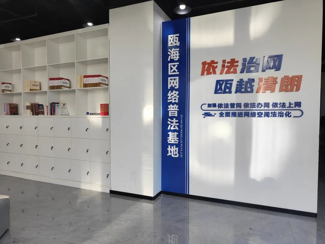 瓯海区网络普法基地位于区新时代文明实践中心(区行政管理中心6号楼2楼),基地以弘扬网络文明、清朗网络生态为主基调,融入互联网法治元素,设置网信普法角、大V分享汇、E案释法台、法治交流区等功能模块,同时委派驻点律师为公众提供实实在在的法治服务。