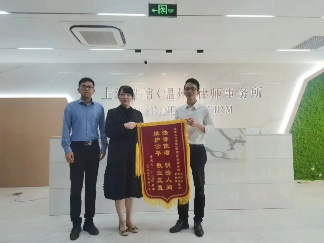 2022年10月11日,当事人到浩信(温州)所向黄雅俊、黄瑞焰律师和高级顾问王佳乐送上锦旗,感谢他们在案件中尽心尽责,为当事人争取到了合法权益。