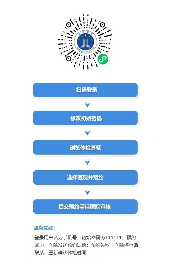 1、市律师协会统一组织的体检时间为10月17日至12月10日。请鹿城、龙湾、瓯海、洞头四个区的律师通过“温州律协”公众号-菜单栏“温州律协”-“律师体检”或扫码进行体检预约,登录用户名为省厅备案手机号,初始密码111111(预约流程详见附件)。待体检中心确认后,最终确定体检时间。
