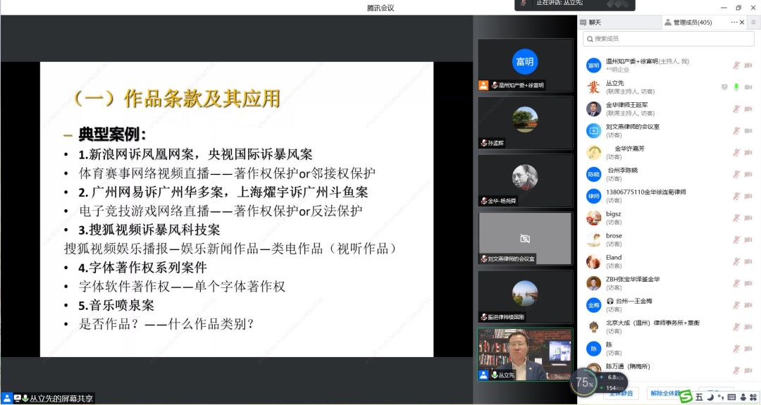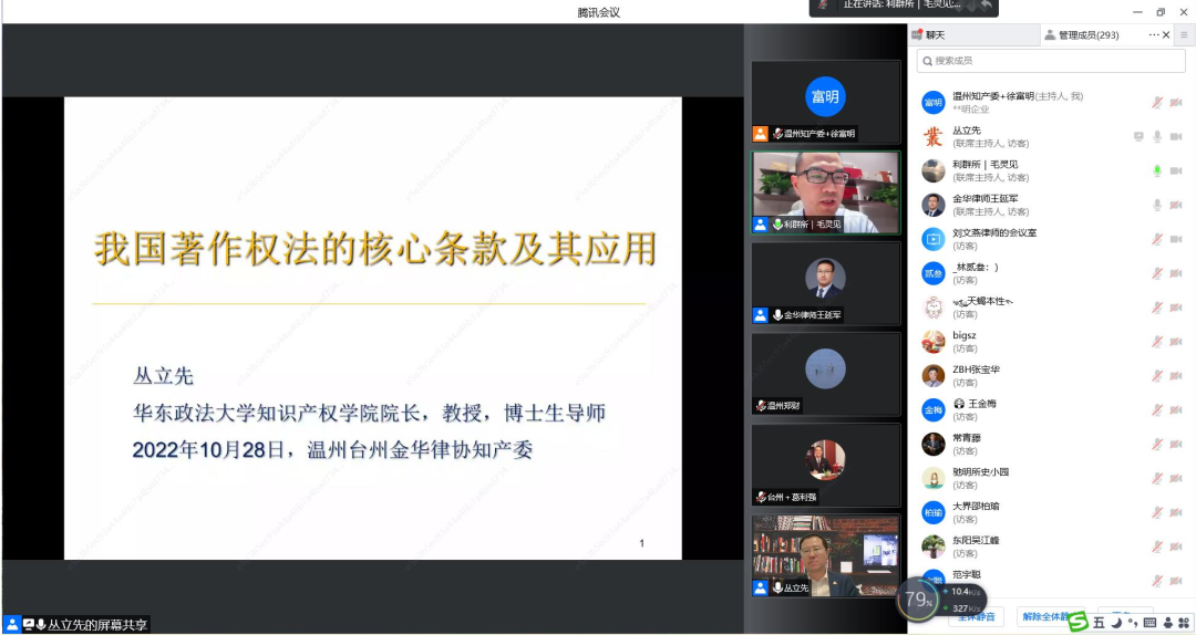 继上半年专利板块培训按期精彩完成以后,为回应三地律师对知识产权学习的热情,著作权版块的培训如期举行。20221028日,著作权版块第一讲我国著作权法的核心条款及其应用专题讲座通过在线直播的方式举行。本次讲座邀请了华东政法大学知识产权学院院长、教授、博士生导师、武汉大学法学博士、中南财经政法大学法学博士后、教育部新世纪优秀人才、全国知识产权领军人才、国家知识产权专家库专家丛立先老师主讲,温州、台州、金华三地市律师共计500多人次参加培训。