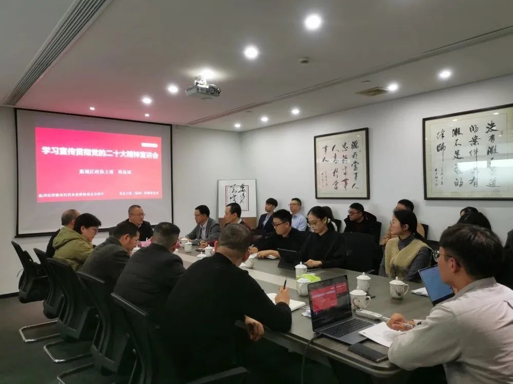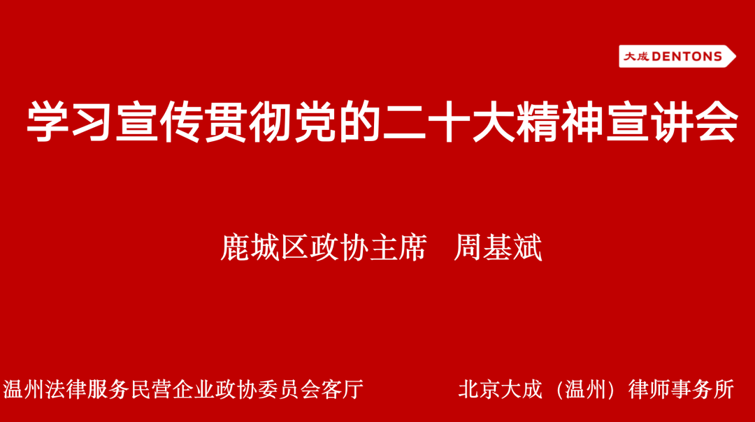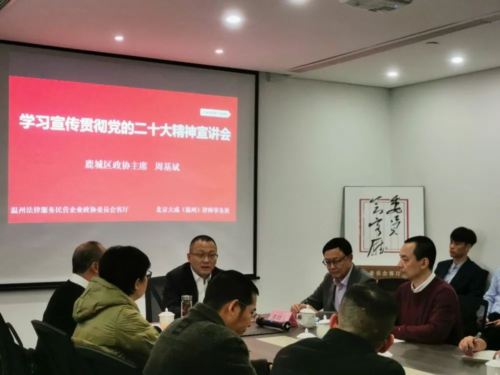 12月8日下午,大成(温州)办公室与温州法律服务民营企业政协委员会客厅共同举办学习二十大会议精神宣讲会,并邀请了温州市鹿城区政协党组书记、主席周基斌莅临参观指导,宣讲二十大会议精神。大成(温州)办公室主任、温州法律服务民营企业政协委员会客厅牵头人金克明担任本次宣讲会的主持人。