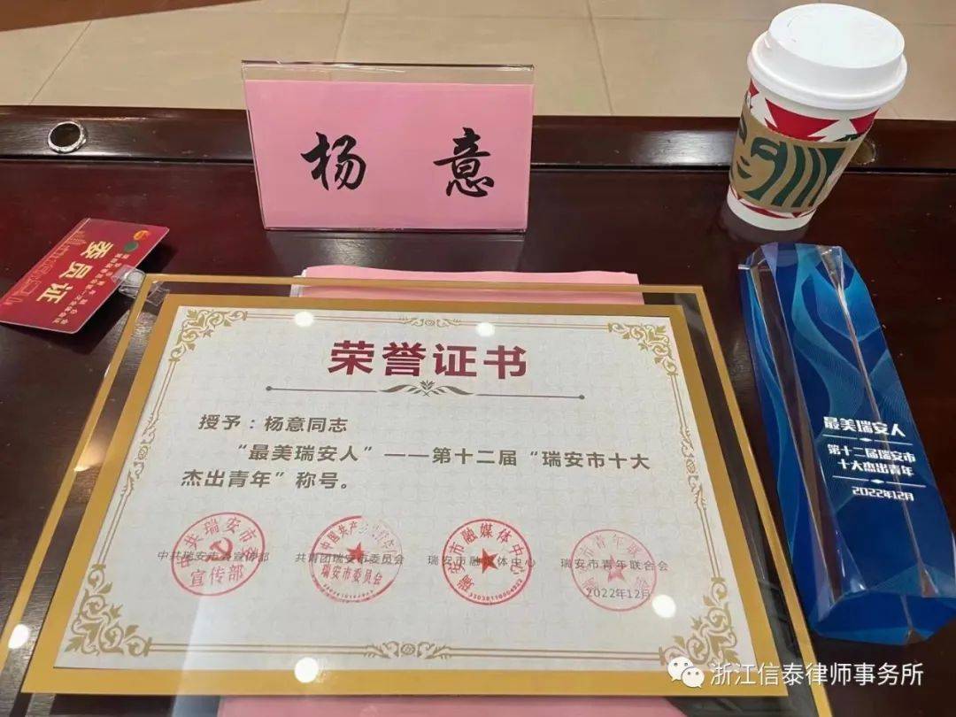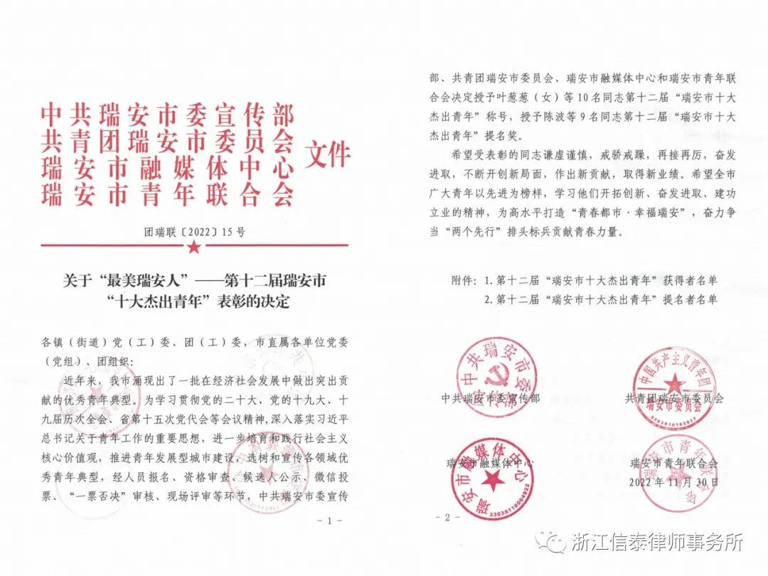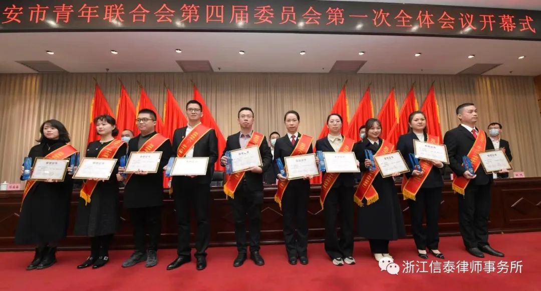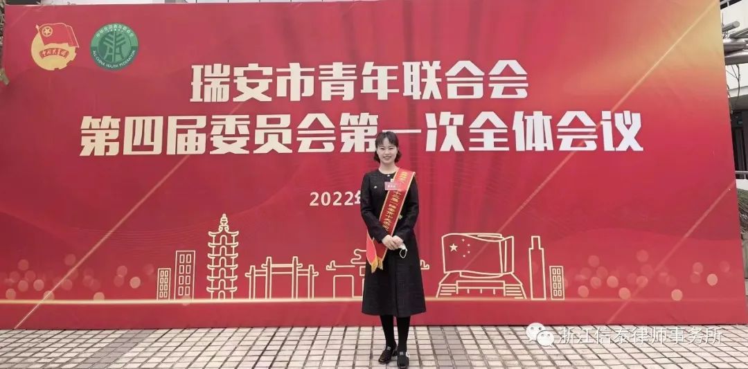 经过两个月的层层筛选和评审,信泰律所副主任杨意律师荣获“瑞安市十大杰出青年”称号,并当选瑞安市青年联合会第四届委员,于2022年12月15日召开的瑞安市青年联合会第四届委员会第一次全体会议上接受表彰。