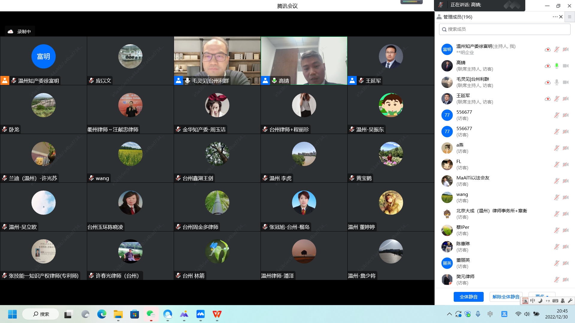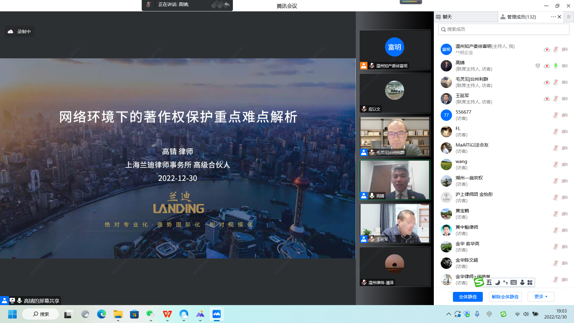 为进一步提升律师专业化能力,培养更多的懂知产、会知产的专业律师,温州、台州、金华三地市律师协会联合举办律师知识产权业务培训系列讲座,讲座分商标、专利、著作权、不正当竞争等版块。2022年12月30日,著作权版块第六讲“网络环境下的著作权保护重点难点解析”专题讲座通过在线直播方式举行。本次讲座邀请了上海兰迪律师事务所高级合伙人、上海大学法学院校外导师高锖律师主讲,包括温州、台州、金华三地律师在内共计230多人次参加培训。