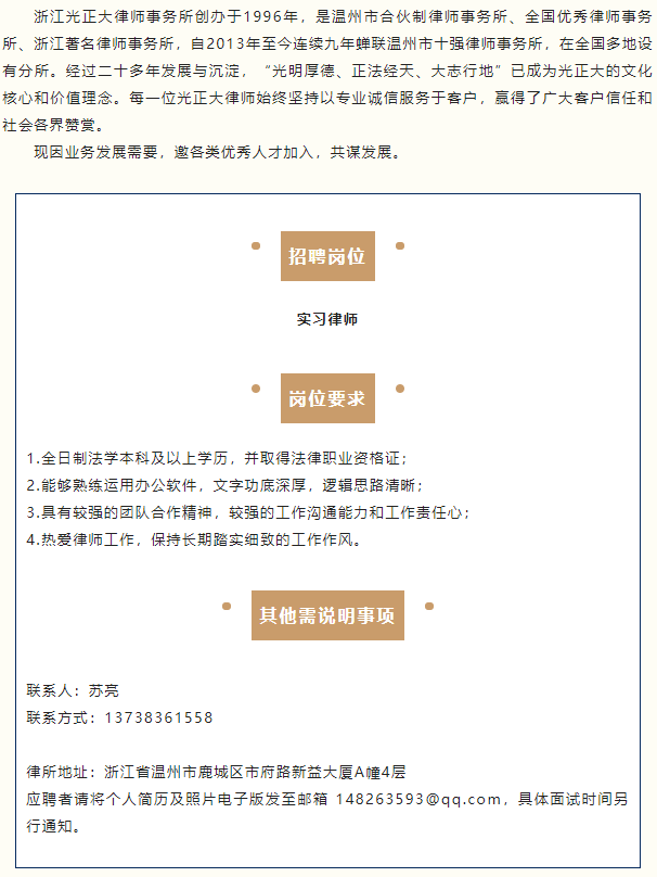 浙江光正大律师事务所招聘启事