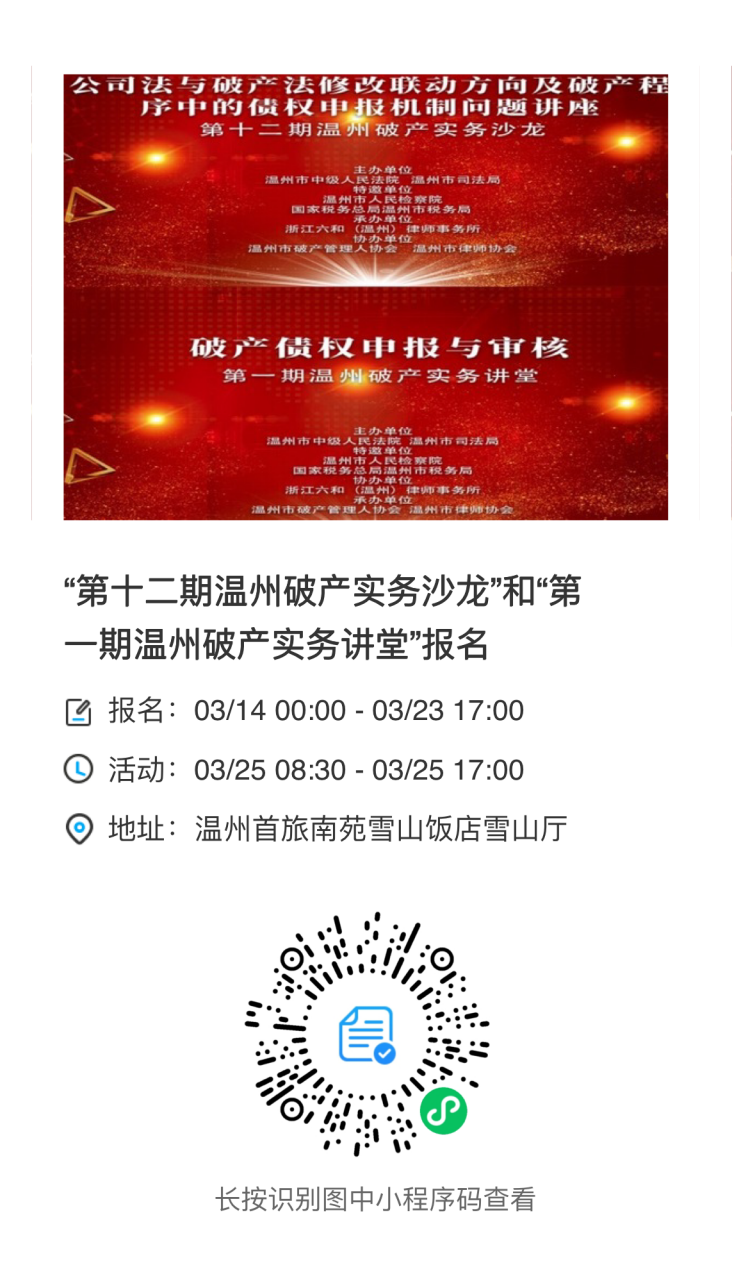 为了进一步提升我市破产审判工作水平,提高破产管理人履职能力,现决定举办第十二期温州破产实务沙龙和第一期温州破产实务讲堂。具体事项通知如下: