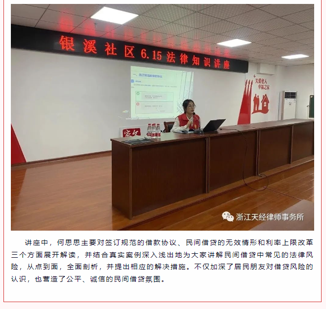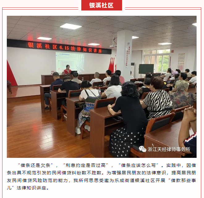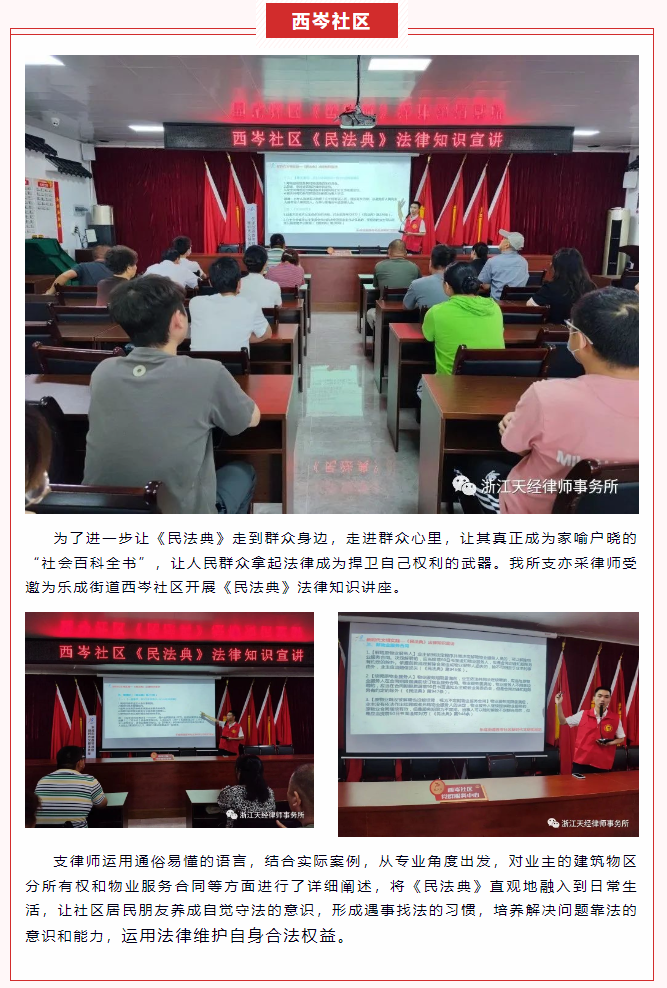 随着“万名律师进村(社区)开展万场法治宣讲”活动的持续开展,我所多名律师受邀为各社区居民朋友带来一场又一场丰富实用的普法宣传讲座。争取让法治意识深入人心,切实提高居民的法律素质,推动社区的法治建设,共建和谐社会发展。