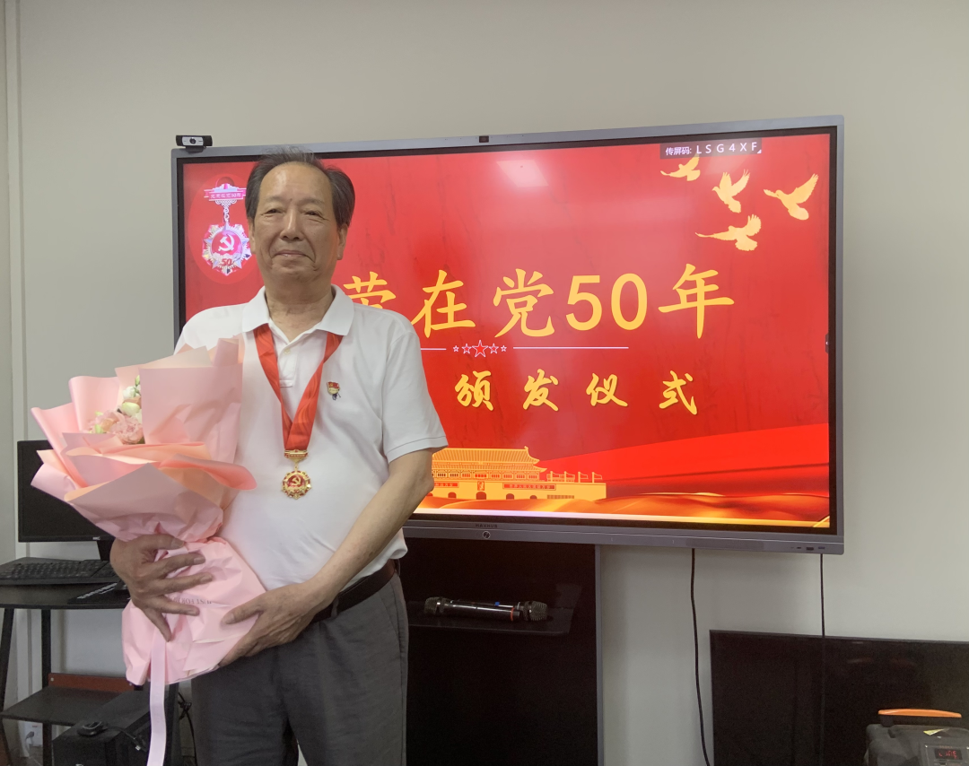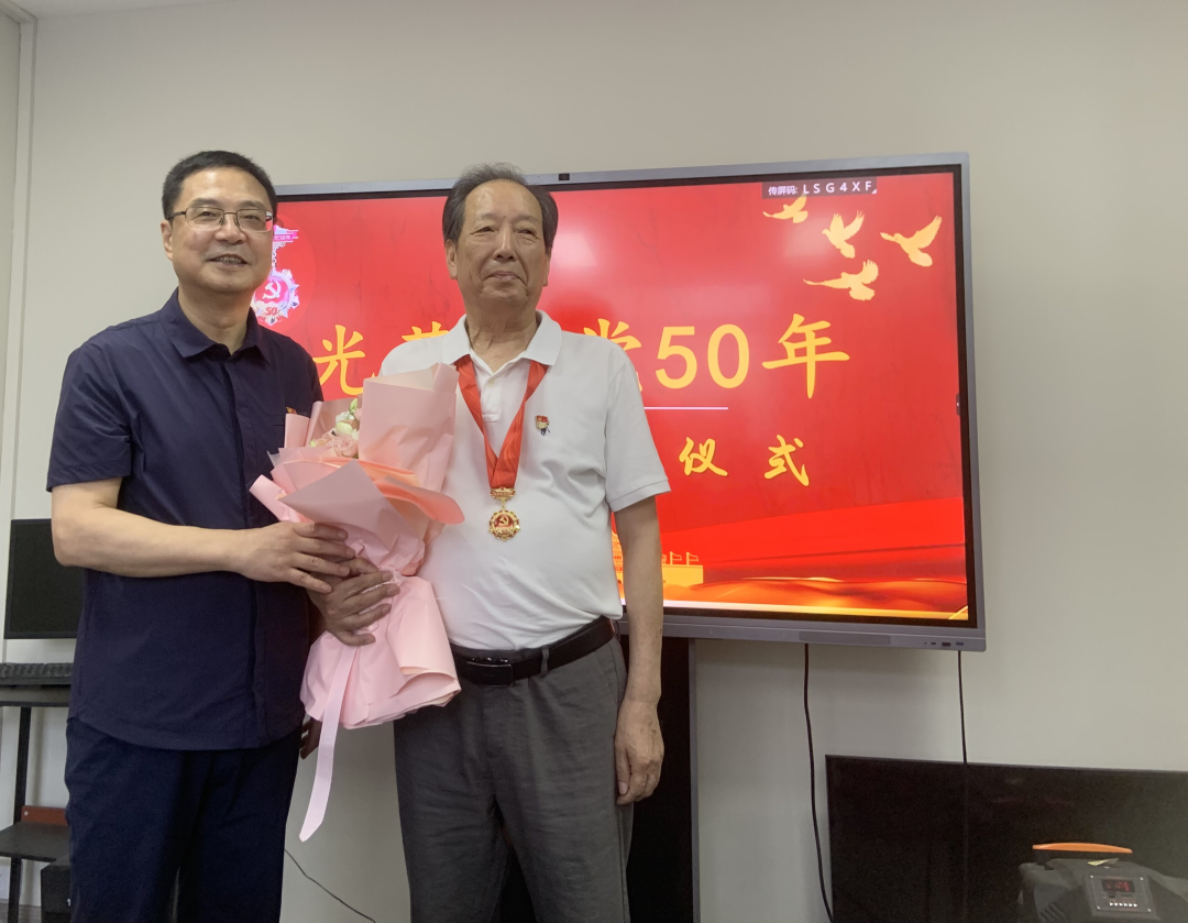 7月12日,市律师行业党委副书记、市律师协会会长金疆,市司法局律师工作处副处长、市律师行业党委专职副书记陈秋晨一行赴浙江联英(乐清)律师事务所,为党龄满50周年的何国泽同志颁发“光荣在党50年”纪念章。
