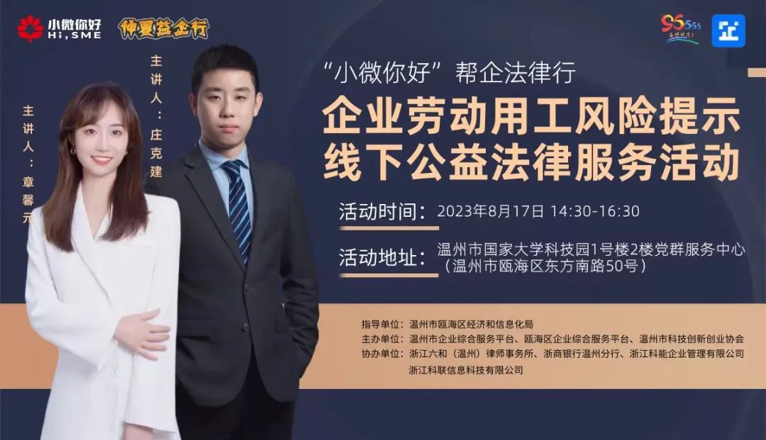 2023年8月17日下午,为贯彻落实浙江省“小微你好”暖企助企惠企专项行动,降低用人单位劳动用工法律风险,进一步优化营商环境,我所庄克建律师、章馨元律师受邀参与了“小微你好”帮企法律行——企业劳动用工风险提示线下公益法律服务活动。