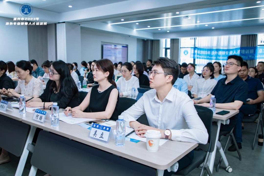 为切实加强温州市涉外律师队伍建设,进一步提升涉外法律服务水平,全面落实浙江省关于深化涉外法律服务业发展专项行动的计划要求,8月26日,由温州市律师协会主办,涉外与海事海商(海洋经济)专业委员会承办的温州市2023年涉外专业人才培训班(总第一期)顺利开班。市律师协会会长金疆、副会长严凌振出席并讲话,开班仪式由涉外专业委主任何旸主持。市律协涉外专业委委员、涉外人才库律师等90余人参加培训。