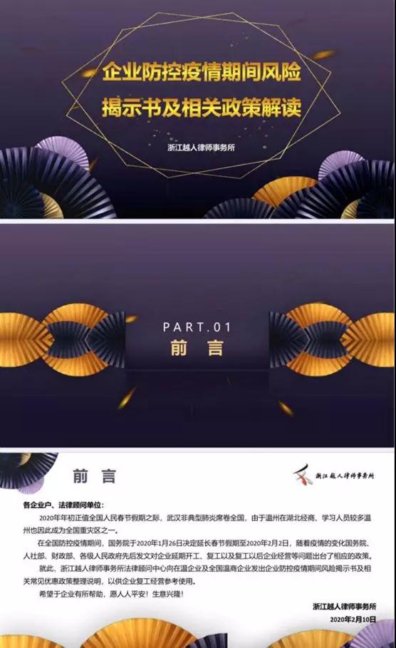 浙江越人律师事务所向在温企业及全国温商企业发出《企业防控疫情期间风险揭示书及相关政策解读》,重点围绕延长春节假期期间及延期复工期间的用工问题,详细解答了员工因疫情被医学隔离观察期间的薪酬待遇、企业能否通知职工提前返岗、员工接到提前返岗通知未返岗的能否按旷工处理等系列问题,方便企业“按书检索”。同时,对与企业利益关联较大的社保、税收等方面的优惠政策进行了详细解读。