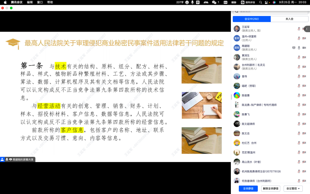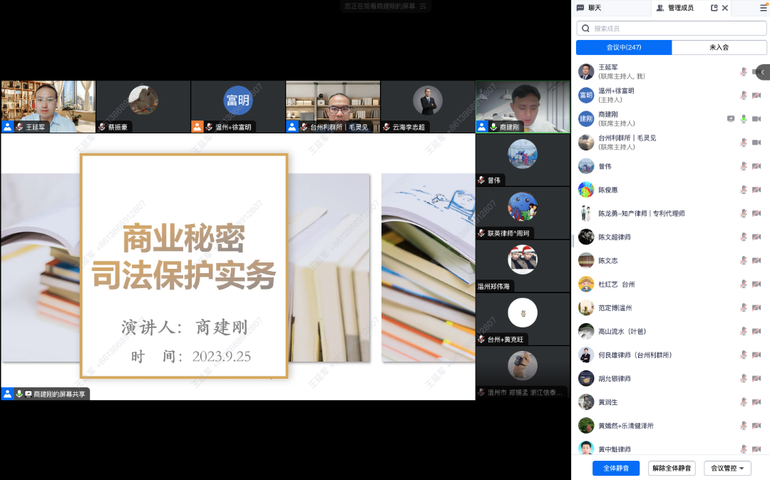 2023年9月25日,反不正当竞争版块第四讲“商业秘密司法保护实务”专题讲座通过在线直播方式举行。本次讲座邀请了有着多年律师、法官职业经历的上海政法学院经济法学院副教授、硕士生导师、丝绸之路律师学院执行院长商建刚老师主讲,温州、台州、金华三地市律师共计近360人次参加培训。