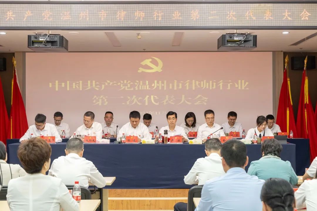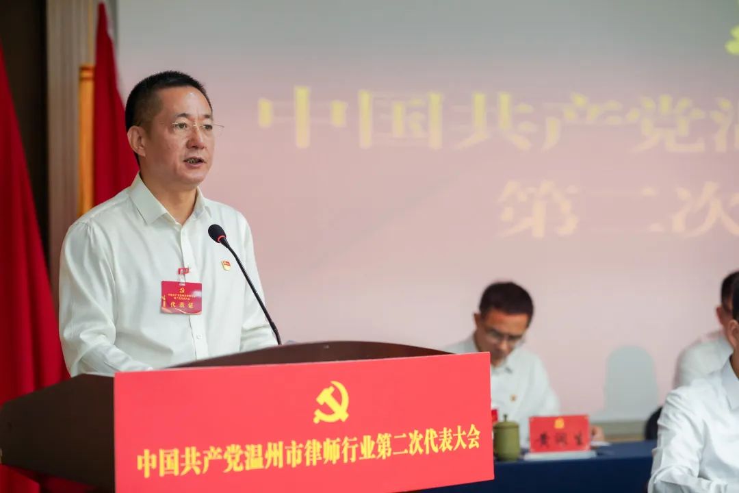 省司法厅律师工作处处长、省律师行业党委副书记杨建对大会的召开表示祝贺,他充分肯定了温州市律师行业五年来取得的显著成效。他指出,要牢记习近平总书记关于“非公企业党组织要能够发挥实质作用,防止成为‘花架子’”重要指示批示,接续发力,持续推动温州律师行业党建走在前、当表率。一要永葆政治本色,争当对党忠诚的模范生。必须把拥护中国共产党的领导、拥护社会主义法治作为律师从业的基本要求,深刻领悟“两个确立”的决定性意义,增强“四个意识”、坚定“四个自信”。二要突出示范引领,争当行业党建的排头兵。及时总结推广基层创造的鲜活经验,打造具有鲜明辨识度的温州律师行业,在全省乃至全国都叫得响的党建工作品牌,为全省律师行业党建发展贡献更多温州样板经验。三要注重守正创新,争当服务发展的弄潮儿。要紧扣“勇当先行者、谱写新篇章”新定位新使命,不断传承弘扬新时代“四千”精神,助推民营经济实现新发展。深入贯彻落实司法部党组“五点希望”要求,引导广大律师更广泛、更主动参与公共法律服务,以律师之能应民生之盼、解群众之需。