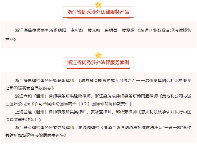 开幕式上,我市1件涉外法律服务产品获评“浙江省优秀涉外法律服务产品”,4件涉外法律服务案例获评“浙江省优秀涉外法律服务案例”。