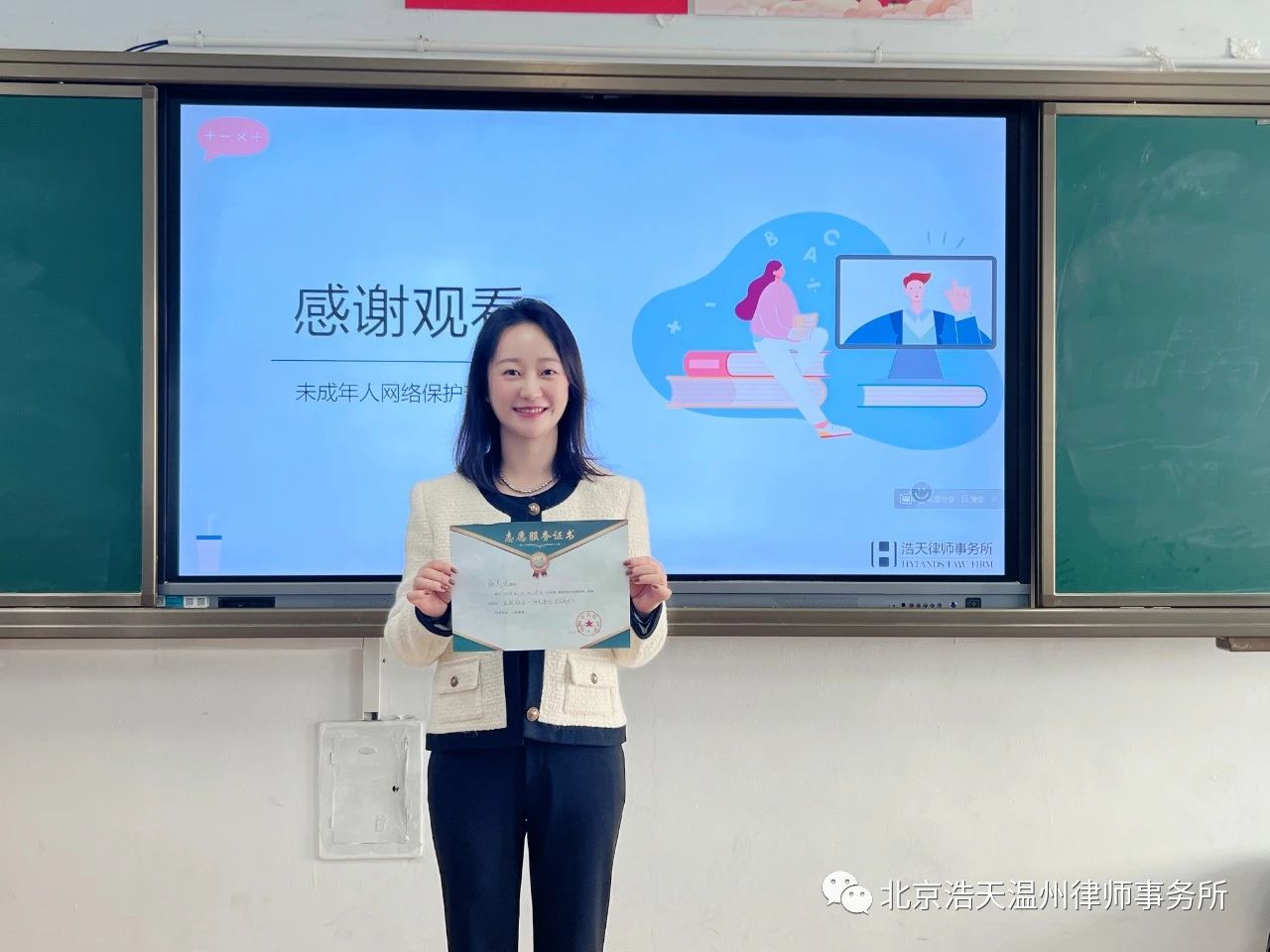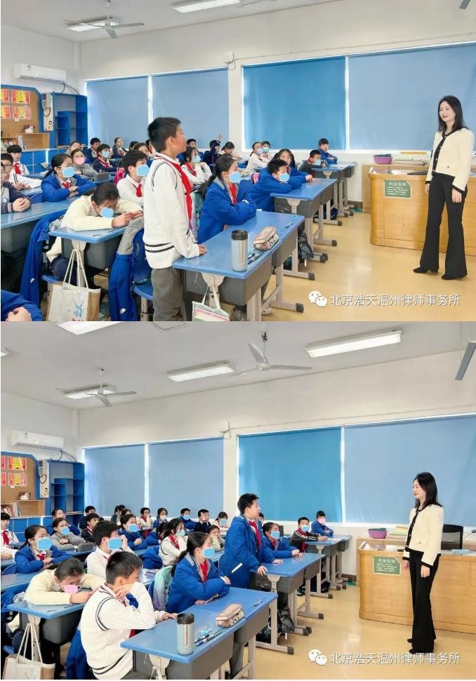 为进一步提升《未成年人网络保护条例》学习宣传和普法工作,切实增强未成年人网络安全意识,营造有利于未成年人身心健康的网络环境,保障未成年人合法权益。2023年12月28日上午,北京浩天(温州)律师事务所主任韩笑律师走进温州市实验小学六年五班开展“阳光净网·护苗成长”未成年人网络保护普法公益讲座。