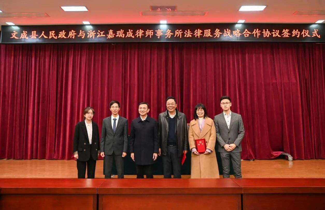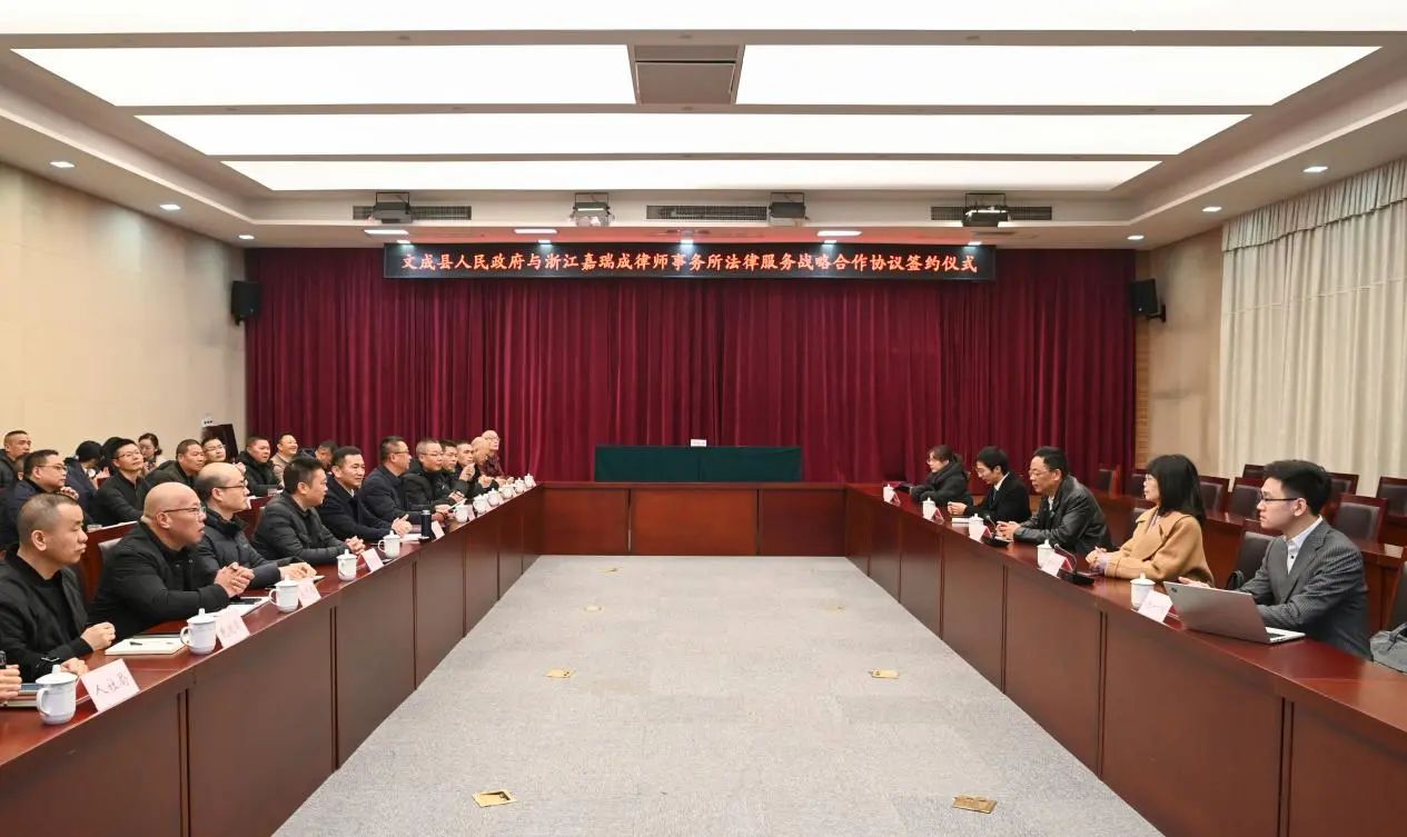 为贯彻法治思维,推进法治政府建设,2023年12月27日上午,浙江嘉瑞成律师事务所与文成县人民政府法律服务战略合作协议签约仪式在文成县人民政府隆重举行。文成县副县长林伟、各局领导,嘉瑞成所党总支书记童洪锡,律师黄丹丹、沈志超、张一阳等出席仪式。