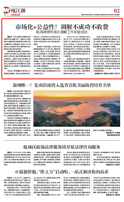 今年,温州各地陆续试点律师市场化调解工作。瓯海区人民法院探索适应市场发展规律和纠纷实质化解新路径,推动建设“信访打头、调解为主、诉讼断后”的矛盾纠纷多元化解机制,现已见初步成效。