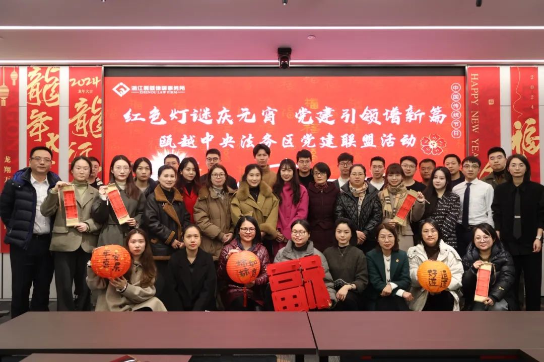 为深化传统文化之传承,促进文明之风尚,2月23日上午,瓯越中央法务区党建联盟举行“红色灯谜庆元宵、党建引领谱新篇”活动。由本次轮值单位浙江震瓯律师事务所党支部承办,组织党建联盟党员开展迎元宵猜灯谜活动。