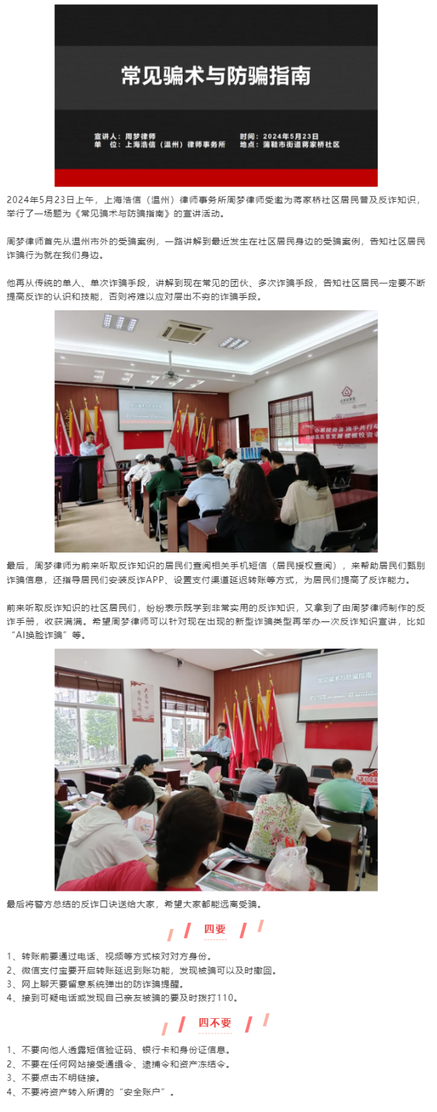 浩信(温州)所周梦律师受邀为蒋家桥社区开展反诈知识宣讲