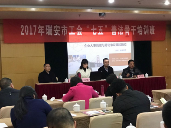 2017年12月6日、7日,浙江信泰律师事务所杨意律师、丁飞飞律师受邀在寨寮溪为瑞安市总工会、各乡镇街道工会主席、部长等骨干举行了主题为“企业人事管理与劳动争议风险防控”及“民法总则亮点解读”的“七五”普法培训课。此次讲座由瑞安市总工会举办,市总工及全市23个乡镇街道总工会主席、部长等骨干参加了培训。