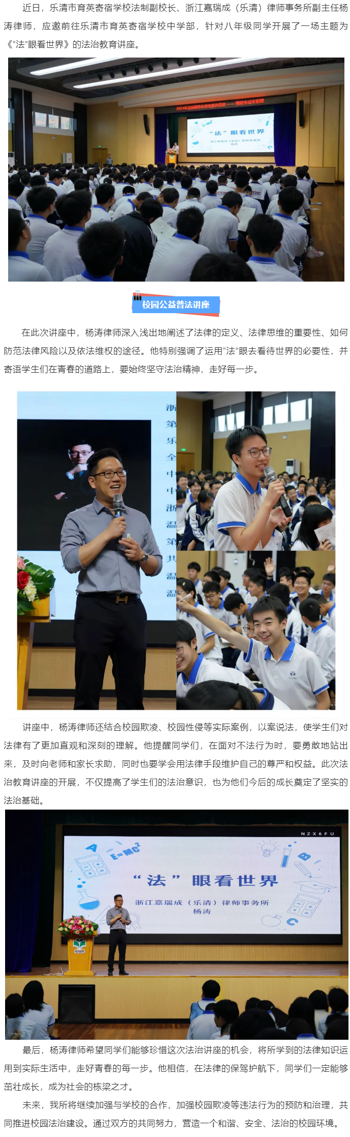 嘉瑞成乐清所杨涛律师应邀为乐清市育英寄宿学校中学部开展法治教育讲座
