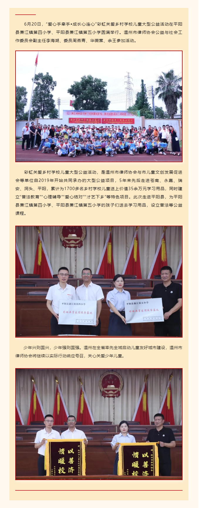 爱心手牵手•成长心连心——温州律协开展“2024年第七届彩虹关爱乡村学校儿童大型公益活动走进平阳”