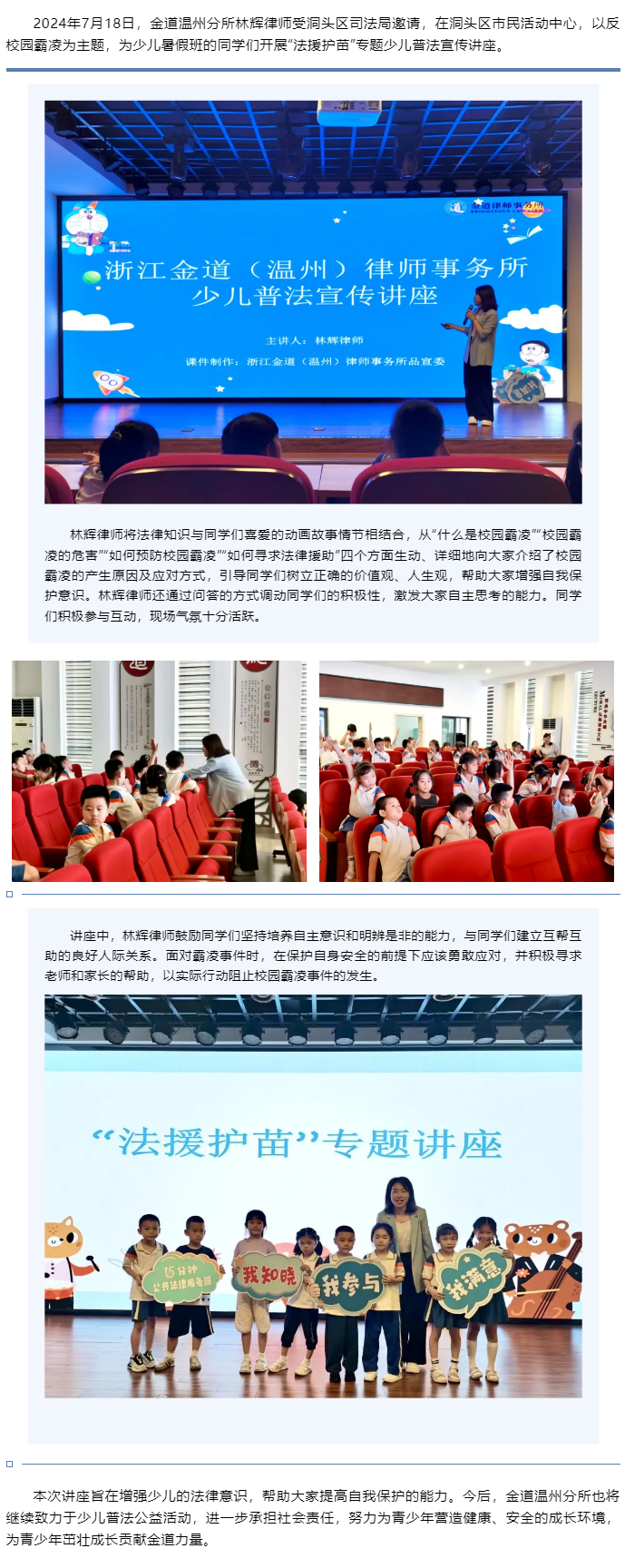 金道温州所林辉律师应邀为洞头区市民活动中心少儿暑期班开展“法援护苗”专题少儿普法宣传讲座
