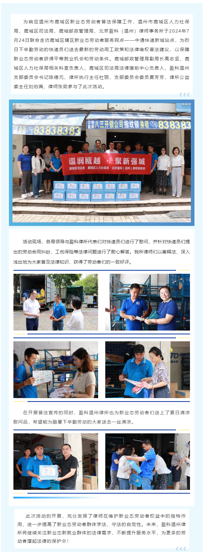 区人力社保局、区司法局、邮政管理局、盈科温州律所联合走访新业态劳动者服务网点开展“普法送清凉”活动
