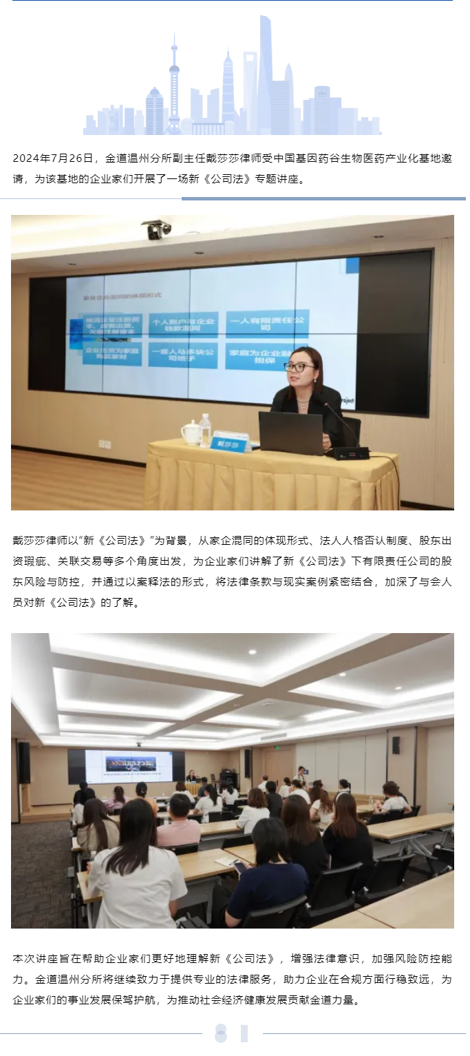 “律企同行 助企远航”——金道温州所戴莎莎律师应邀为中国基因药谷生物医药产业化基地企业家开展新《公司法》讲座