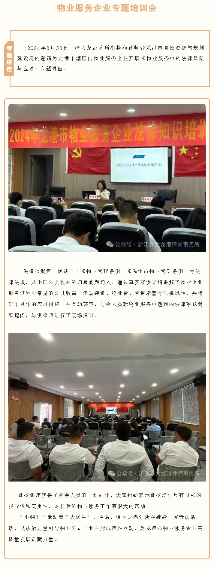 泽大(龙港)所洪榕净律师受邀为龙港市物业服务企业开展专题培训