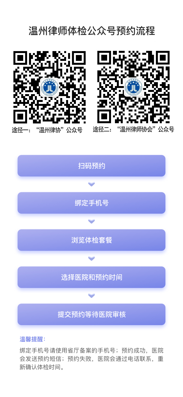 市律师协会统一组织的体检时间为9月20日至11月30日。鹿城、龙湾、瓯海、洞头四个区,以及报名参加市律协体检的县(市)的律师请通过以下途径进行体检预约: