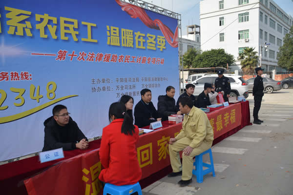 针对“岁末年初”欠薪纠纷易发多发的特点,平阳县司法局积极引导律师参与“情系农民工 温暖在冬季”法律援助农民工讨薪专项行动,通过宣传引导、服务前置、方法创新等“一条龙”式服务,确保农民工讨薪维权“零贻误”、“不落空”。