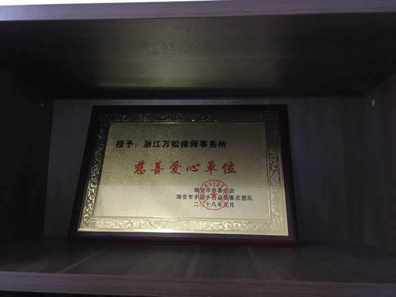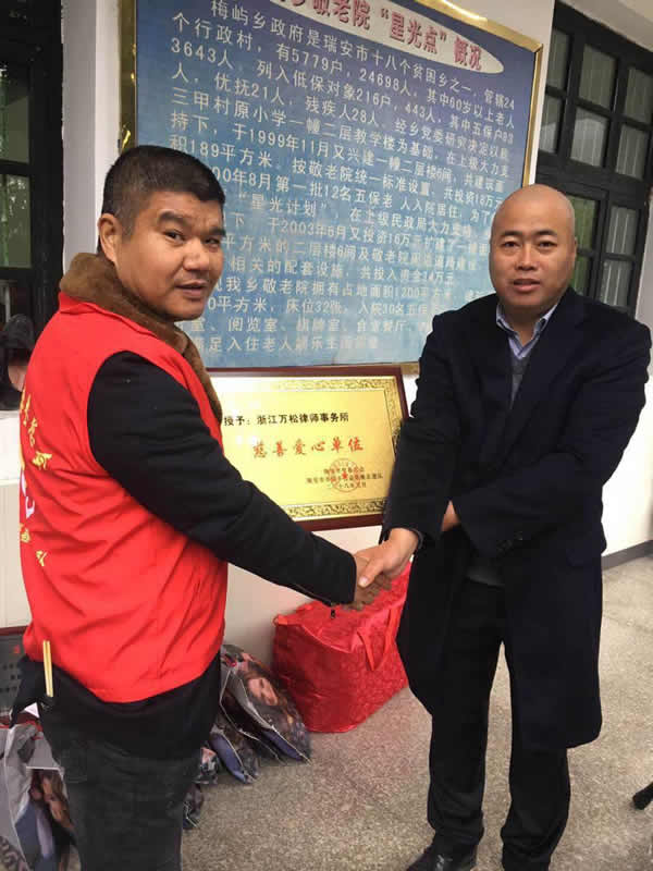 近日,浙江万松律师事务所荣获瑞安市慈善总会和瑞安市手搭手慈善公益志愿队授予的2017年度慈善爱心单位。 2016年以来,浙江万松律师事务所担任瑞安市慈善总会瑞安市手搭手慈善公益志愿队无偿法律顾问,该所依托该志愿队的慈善公益活动平台,多次进社区为群众进行免费法律咨询及普法活动,获得了社会公众的一致好评。 瑞安市司法局法管科 浙江万松律师事务所