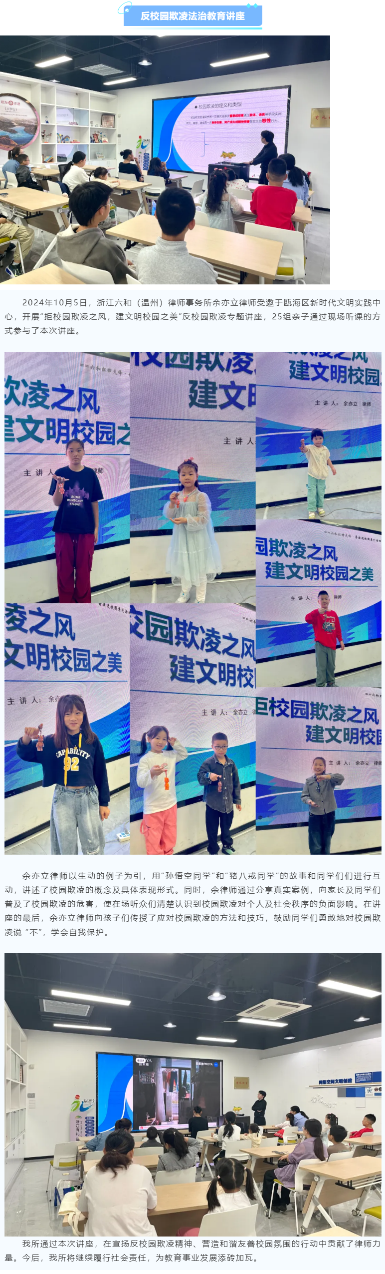 六和温州所余亦立律师受邀开展反校园欺凌法治教育讲座