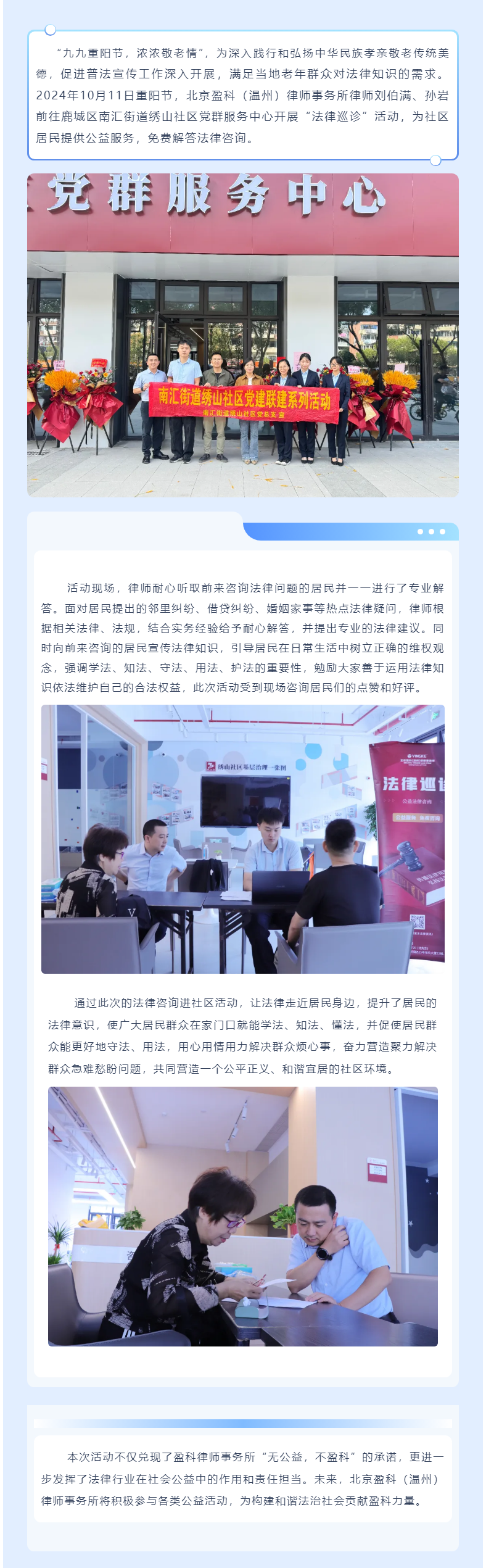 “情暖金秋,法润重阳”,盈科温州所律师前往鹿城区南汇街道绣山社区党群服务中心开展“法律巡诊”公益活动