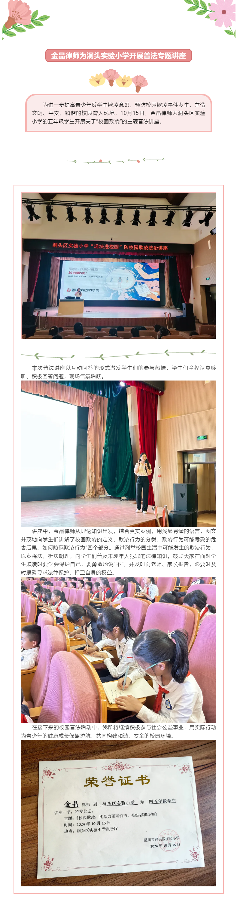 泽商所金晶律师为洞头实验小学开展普法专题讲座