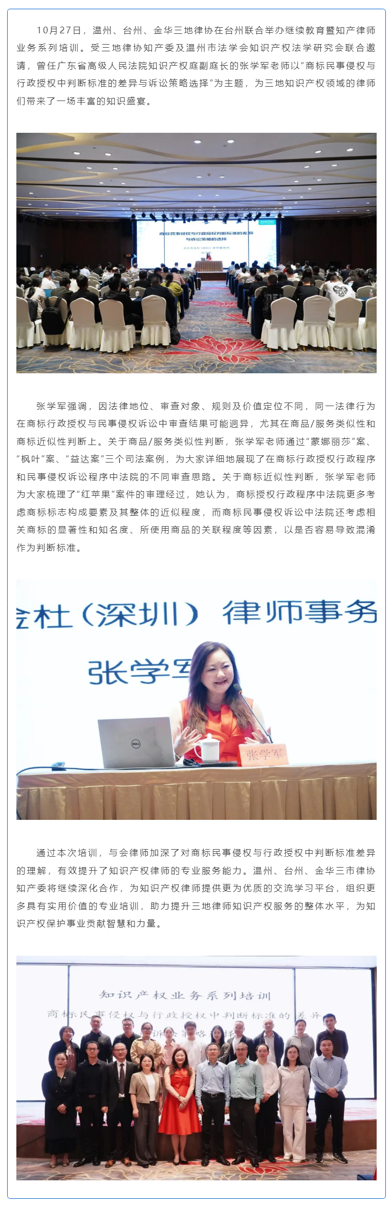 温州、台州、金华三地律协联合举办继续教育暨知产律师业务系列培训之“商标民事侵权与行政授权中判断标准的差异与诉讼策略选择”专题讲座