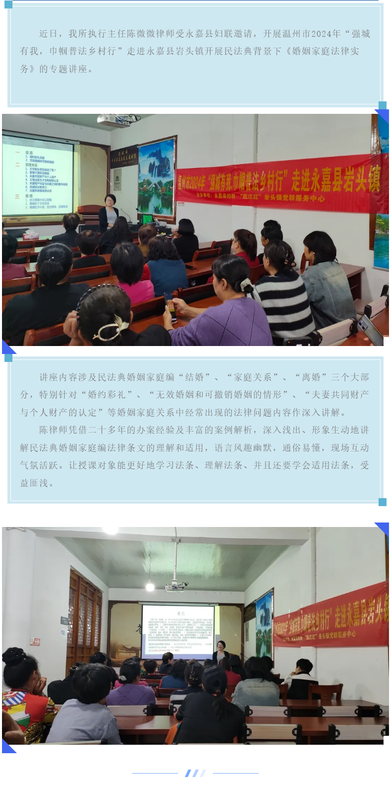 聚祺所陈微微律师受永嘉县妇联邀请为岩头镇居民开展《婚姻家庭法律实务》专题讲座
