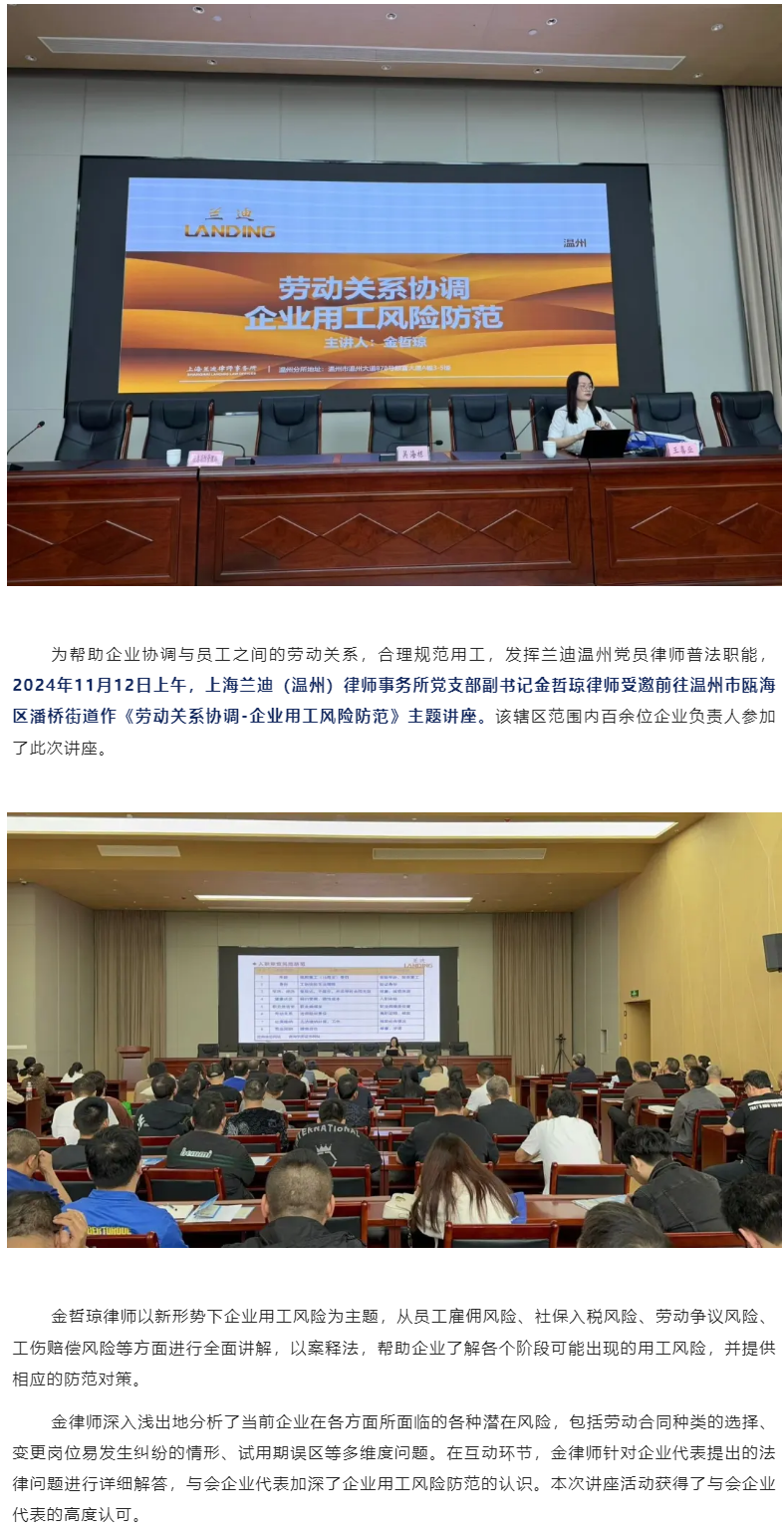 兰迪温州所金哲琼律师受邀开展“劳动关系协调-企业用工风险防范”讲座
