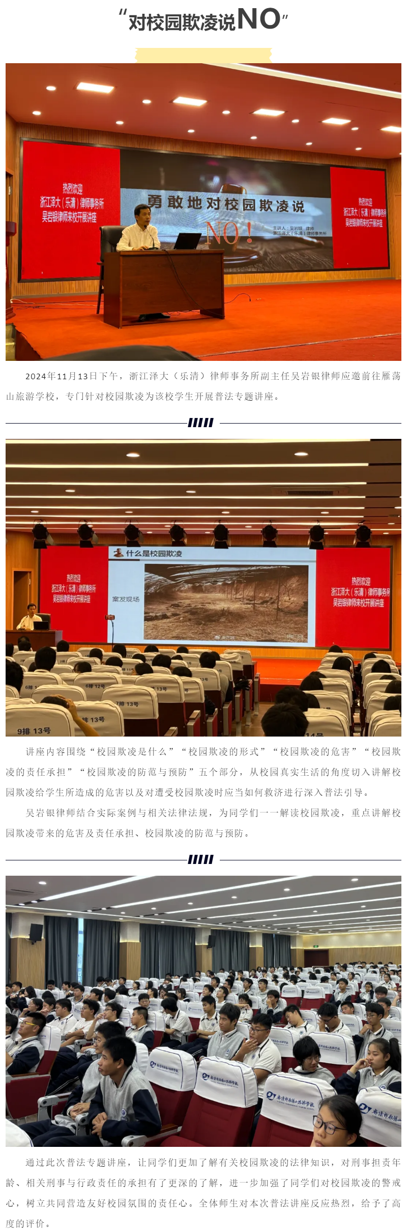 泽大乐清所吴岩银律师受邀为雁荡山旅游学校开展“勇敢地对校园欺凌说NO”普法专题讲座