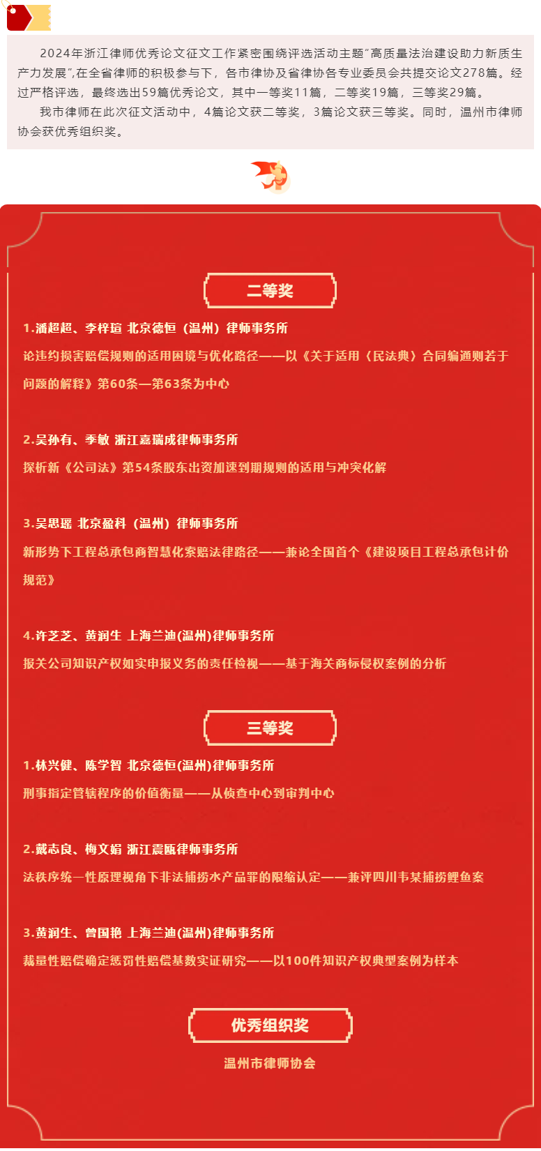 祝贺!我市7篇论文获评2024年浙江律师优秀论文